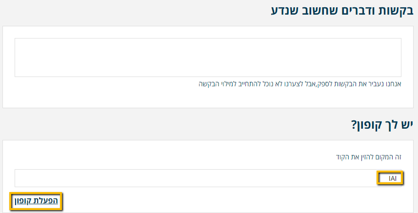 בעמוד בו אתם מכניסים את שמות הנופשים מכניסים קוד קופון